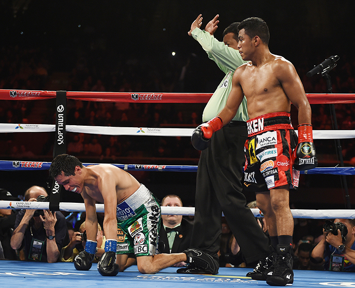 Boxer Roman Gonzalez (R) of Nicaragua knocks out Edgar Sosa of Mexico in the second round AFP PHOTO / MARK RALSTON