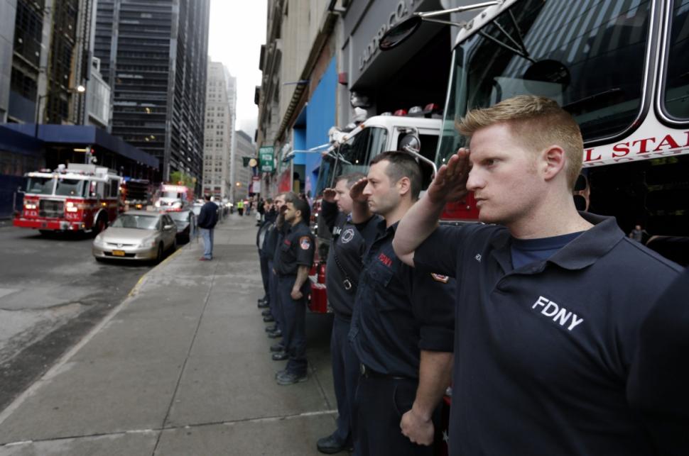 “It was very respectful,” said Rose Foti, whose firefighter son Robert died in the terrorist attack. “The police and firemen lined up. They brought three coffins in. Everyone was silent. Then they brought them down the stairs.”