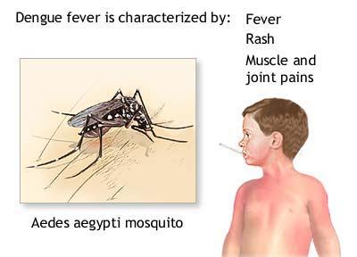 Dengue fever begins with a sudden high fever, often as high as 104 – 105 degrees Fahrenheit, 4 to 7 days after the infection. A flat, red rash may appear over most of the body 2 – 5 days after the fever starts. A second rash, which looks like the measles, appears later in the disease. Infected people may have increased skin sensitivity and are very uncomfortable.