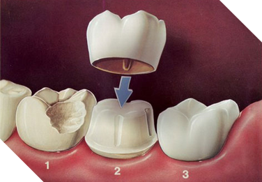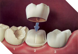 A crown is like a cap that fits over a damaged tooth and resembles a real tooth. They are used on teeth too damaged to be fixed with a filling. The damaged part of the tooth is removed and the cap is placed over the remaining part. They are also used on teeth that had a root canal and on dental implants. They can be made of gold, porcelain, or ceramic. A ceramic porcelin mix provides the greatest ability to color match to the surrounding teeth. A main reason to get a crown is to have a more permanent solution than dentures.