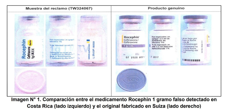 The Dirección de Regulación de Productos de Interés Sanitario, indicated that it is a false version of the drug Rocephin 1 gram. This was found after that on September 30, 2017, a pharmaceutical agent of a private pharmacy in Sarapiquí de Heredia, reported the existence of 10 bottles of Rocephin 1 gram with a different appearance to the labeling that is authorized in Costa Rica.