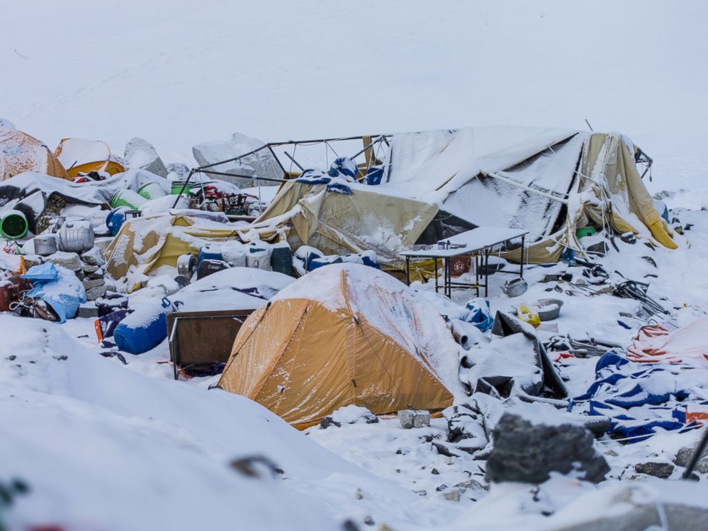 World News – Flying over Mount Everest base camp, a wide track of snow covers where tents once stood.
