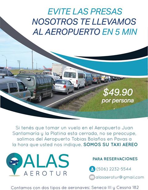 If you are willing to pay US$49.90 (about ¢28,000 colones) to avoid all the traffic mess, going from Pavas (San Jose) to Alajuela, ALAS Aerotur will take you by air in only 5 minutes.