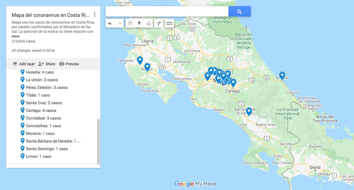 The majority of cases of covid-19 in Costa Rica are in the metropolitan area, including San Jose, Heredia, Alajuela and Cartago. They continue to Grecia and Atenas as well. Some of the cantons with infected people are Santa Barbara, San Pedro de Poas, Barva, San Pablo, Santo Domingo, San Juan District of Tibas, Curridabat, Desamparados, Mata de Platano, Santa Ana, and Escazu.