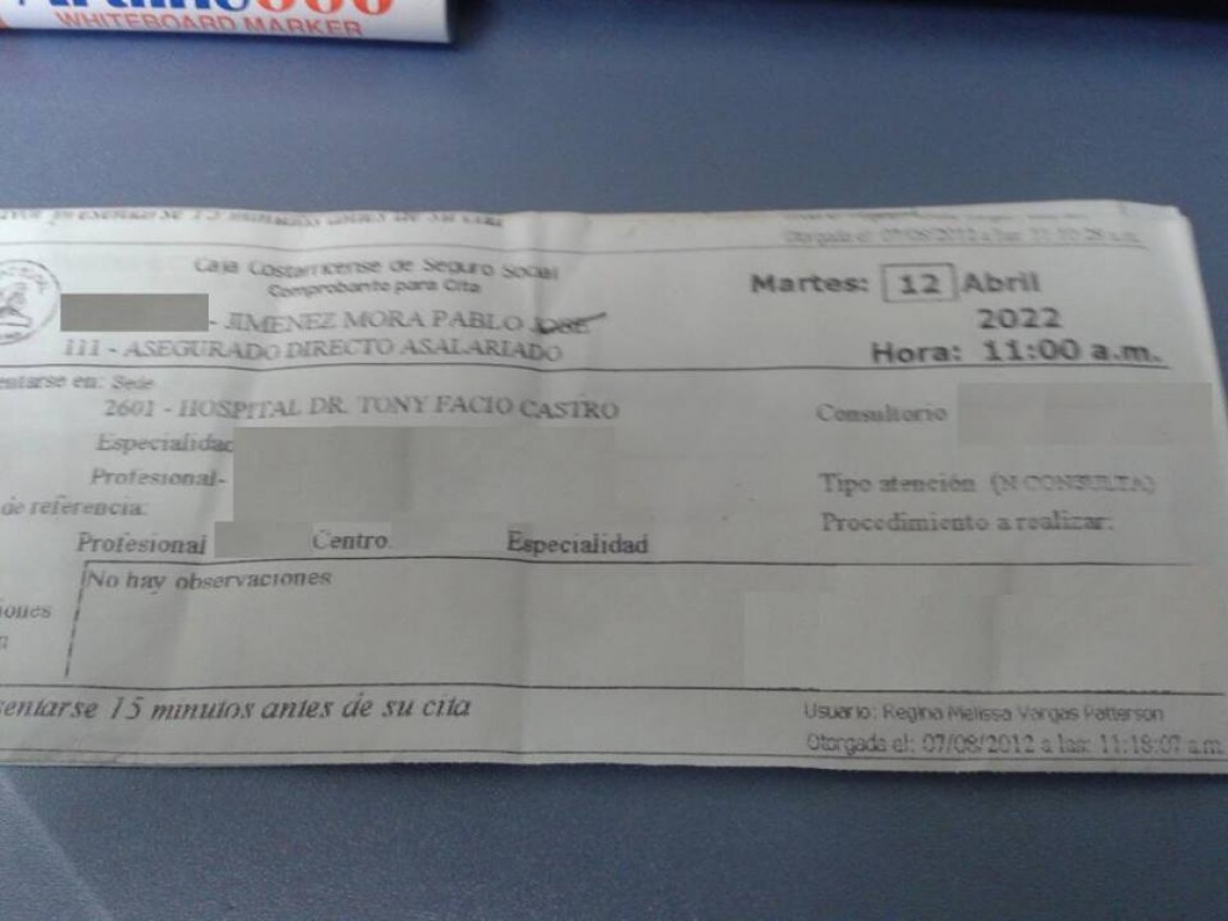 This is an actual doctor’s appointment scheduled by the Costa Rican Caja (state medical system) for April 12, 2022.
