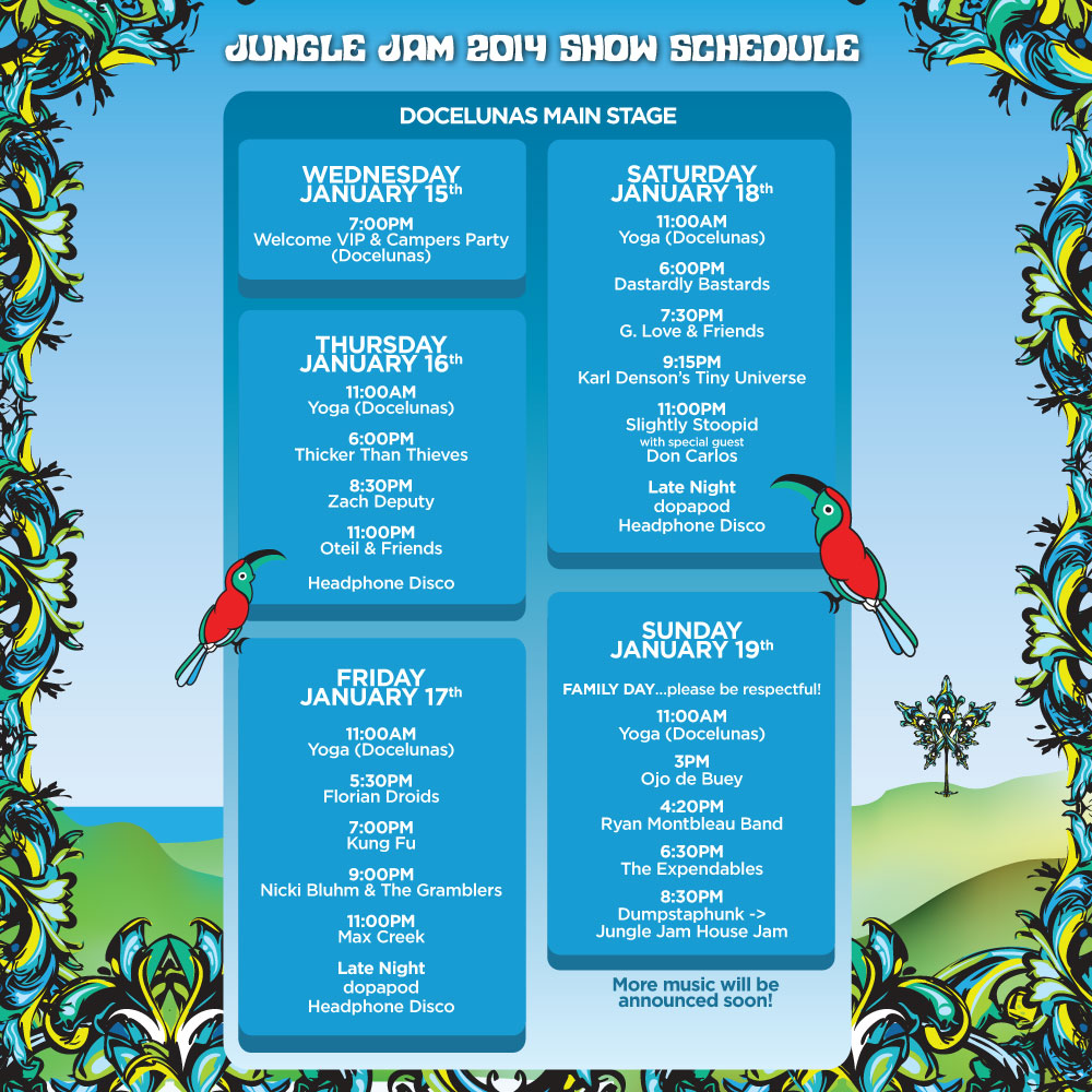 Festival tickets start at just $149 for a four day festival pass and $299 for a six day camping and festival pass. Camping packages include the fullaccess to Jungle Jam IV as well as camping in a secure area and round trip airport transfers. All the amenities of a top notch camping and music festival will be available including showers, food vendors as well as a General Store. The campground will open on January 15, 2014 and close on January 21, 2014.