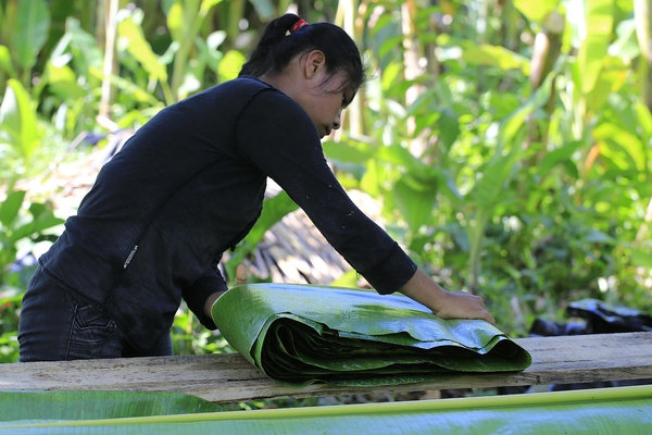 They use the jute plant because banana leaves are less flexible due to chemicals used in fumigations. Jute is smaller with no fruit.